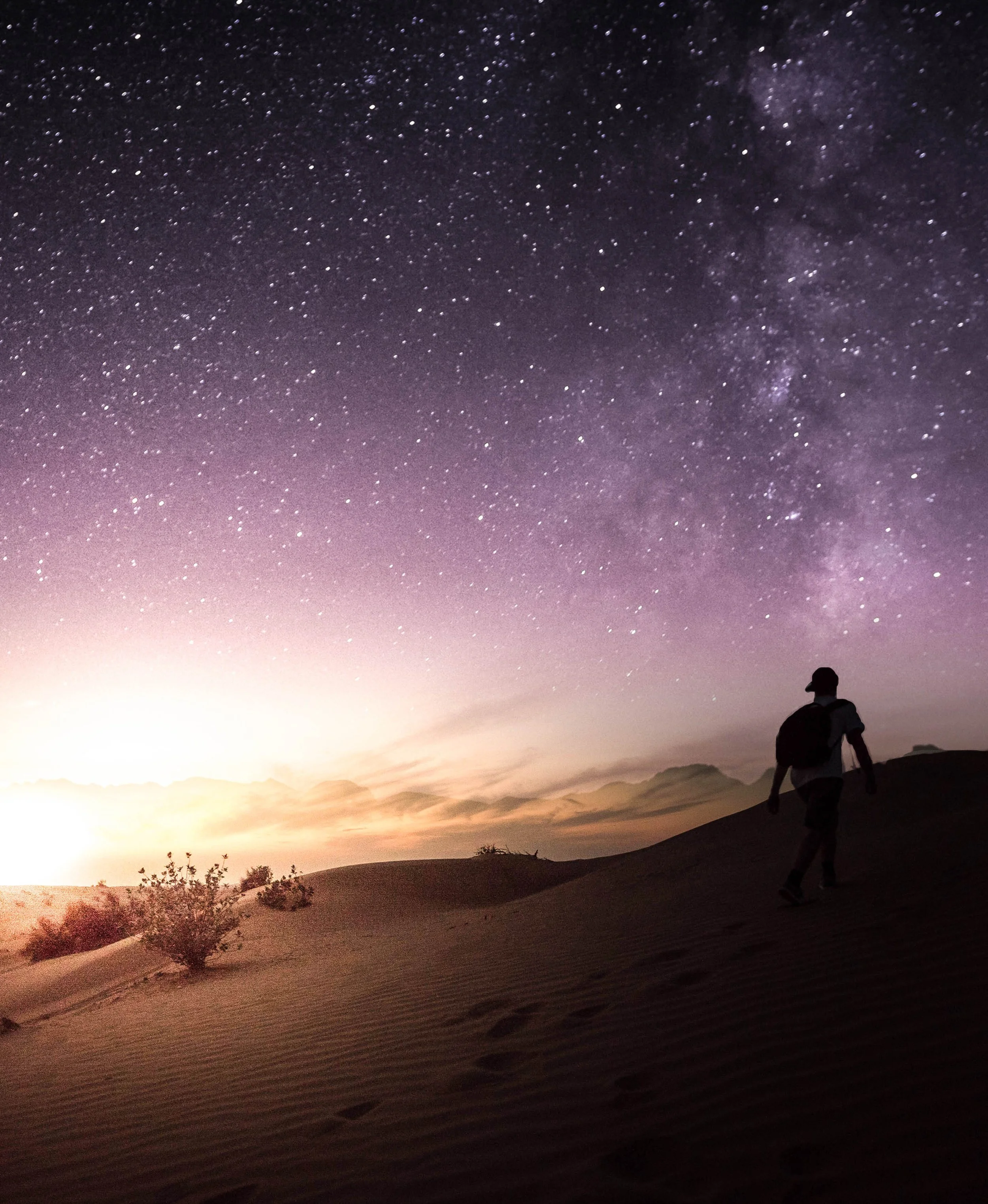 A person walking on sand dunes under a starry deep blue night sky with the Milky Way visible and a bright glow near the horizon.